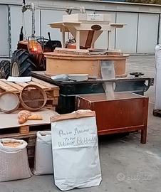 Antica macina a pietra per grano, granone e mais. Il mulino è trasportabile e assemblato con n.2 pietre francesi con un movimento della ditta Giannotti. Dotato di un motore trifase da 16 Cv e, in assenza di energia elettrica funziona anche con trasmissione di un trattore.