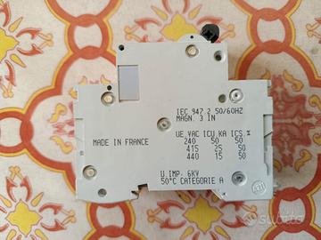 Magnetotermico bipolare con due poli protetti curva Z corrente nominale 6 Amper, corrente di cortocircuito 25000 Amper marca MerlinGerin. La curva Z e' fatta apposta per proteggere da sovraccarichi e cortocircuiti tutte le schede elettroniche, apparecchiature elettroniche.E' eccellente per proteggere condizionatori, pompe di calore, inverter...ecc. Lo vendo solo perche' sono passato ad un condizionatore di potenza maggiore, e quindi ho dovuto prendere di conseguenza un magnetotermico di taglia maggiore. Va benissimo per i condizionatori da 9000BTU e 12000BTU. I magnetotermici con la curva Z, oltre che ad essere rari, sono assai costosi.