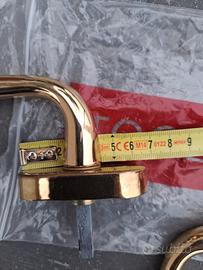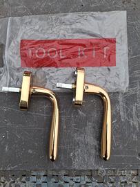 Coppia di maniglie in ottone per finestre, con finitura lucida.