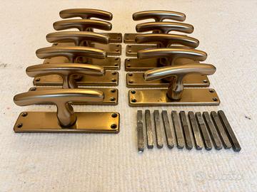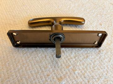 Vendo in blocco n°11 maniglie per finestra complete di perno quadrato. Colore bronzo, robuste e in buone condizioni.