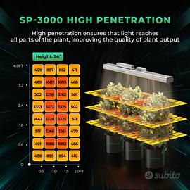 ILLUMINAZIONE AVANZATA PER SERRE: La nuova SP3000 è specializzata per l'illuminazione superiore di serre o ambienti interni, che produce un'elevata ppf di 727,2 μmol/s, un'elevata efficacia di 2,8 μmol/J. L'intensità luminosa è efficiente per penetrare in profondità nella chioma delle piante, fornendo un'ampia luce a ogni foglia e germoglio.
