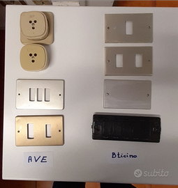 6 placche alluminio color bronzo a 1 posto; 1 interruttore; 8 supporti metallici a 3 posti.