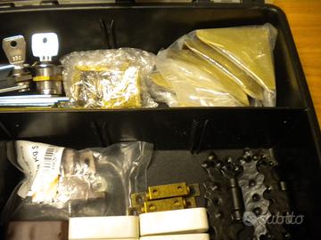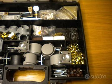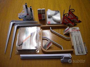 Ci sono, cerniere, barre lineari e raccordi a T, angolari in ottone, rotelline, piedini, chiusure con calamita e ad incastro per antine, fischer+viti ed altro materiale che potete vedere nelle foto.