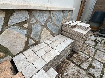 Vando mattonelle della Cerdomus effetto pietra per realizzazioni di cucine rustiche. Mattonelle 10x10 marroni 6mq Mattonelle 10x10 bianche 6mq Pezzi speciali 20x20 bianche 5 pz Mattonelle 40x40 bianche 20pz Battiscopa Il tutto a 100€