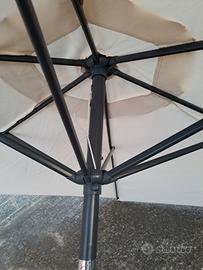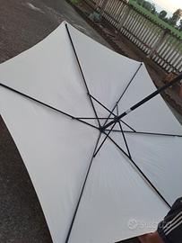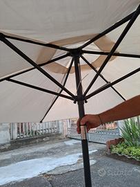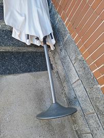 Maxi ombrellone bianco con maniglia per aprirlo e chiuderlo. In ottime condizioni con il bastone e la base, Funzionante, larghezza 2,5 m circa.