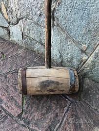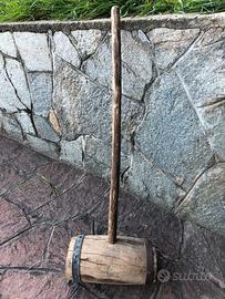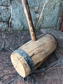 martello di legno pesante, noto anche come mazzuolo o mazza in legno, spesso utilizzato per lavori agricoli o forestali. Testa cilindrica in legno rinforzata con anelli di ferro. Pezzo d’epoca realizzato artigianalmente da falegname Molto bello da arredamento rustico