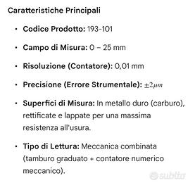 Micrometro Mitutoyo in custodia protettiva, completo di manuale. - Campo di misura: 0-25mm - Precisione: 0.01mm - Marca: Mitutoyo - Include scatola originale e manuale di istruzioni.