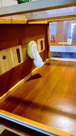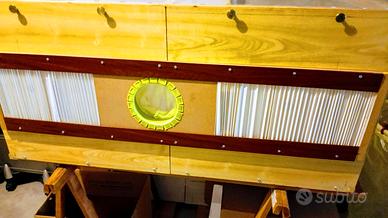 Piccola cabina di verniciatura (misura cm.: L 107 x P 55 x H 50) realizzata interamente da me con legni e plastiche trasparenti. Ermeticamente chiusa permette di verniciare piccoli oggetti tramite bombolette di vernice spray. La parte frontale ha un pannello scorrevole lungo tutta la lunghezza della cabina, tale pannello ha un foro con manichetta in tessuto che consente il passaggio della mano, con guanto, che trattiene la bomboletta di vernice spray. La parte superiore è in plastica dura trasparente per permettere di vedere le manovre all'interno della cabina.