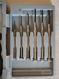 Mini cassetta attrezzi con mini cacciaviti, cacciaviti a stella e taglio, pinze, tonchesi e brucole di varie misure, ingombro 16X10X5cm.