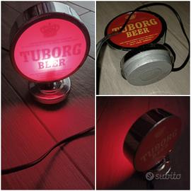 Mini insegna luminosa rotonda. Ne ho tre uguali. 50 euro l'una. MISURE: Altezza 16cm Diametro insegna 11cm Diametro base 8.5cm Pubblicitaria della Birra Tuborg. Creata riciclando la parte finale di una colonna per spillatura da bar. Lampadina normale, non led. Sostituibile con lampadina LED senza problemi. Da collezione. Vintage. Contattami. No Paypal. No perditempo. Spedizione possibile.