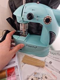 Mini macchina da cucire completa di tutti gli accessori ancora sigillati, non è stata mai usata (scatolo incluso anche se non presente in foto). Adatta per principianti e anche per bambini. Dotata di: 2 livelli di velocità, luce integrata, proteggidita, tagliafilo, sistema a doppio filo per una cucitura più forte. Grazie al tavolo di allungamento incluso si può avere una maggiore superficie e stabilità per i propri lavori. Accessori inclusi: borsa protettiva, tavolo di allungamento, confezione di fili e accessori per il cucito, pedale, trasformatore, bobine e ago di ricambio, istruzioni.