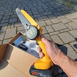 È completa di scatola originale e di tutti gli accessori: caricabatterie, 2 batterie al litio da 24v, 2 catene da 6" di cui una ancora confezionara, chiavi di smontaggio, occhiali di protezione, manuale d'uso.