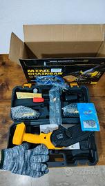 Mini motosega a batteria, nuova, come visibile in foto. Motosega con blocco di sicurezza, catena manuale in acciaio al manganese e oliatore automatico, sega da 15,2 cm. Il kit include 1x valigetta rigida 1x mini motosega 2x batterie 2000 mAh 1x catena di ricambio 1x supporto catena di ricambio 1x caricabatterie 1x occhiali protettivi 1x guanti 1x cacciavite 1x pennello 1x manuale d'istruzioni