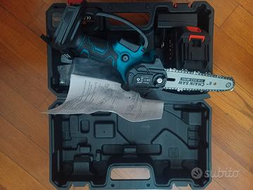 Mini motosega elettrica a batteria nuova... confezione con due batterie da 48v e motosega modello con olio per lubrificare la catena...per qualsiasi informazione contattatemi