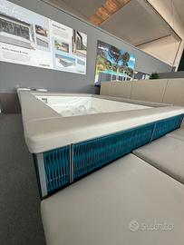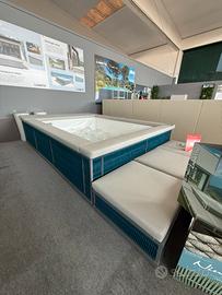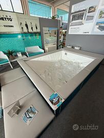 Ninfea thiny garzie alla temperatura delicatamente riscaldata del acqua al massaggio daraia e ai soffici cuscini perimetrali e alla piacevole texture della corda, l’esperienza diventa un piacevole viaggio rigeneranete per corpo e mente, novità del 2025 la piscina dispone di app per il controllo remoto di filtrazione luci riscaldamento e massaggio rendendo la vasca ancora piu smart, le dimesioni dell ingombro totale sono di 3,31x2,33 lo specchio dacqua di 2,45x2