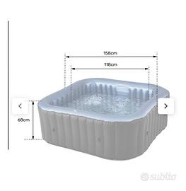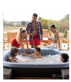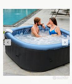 Lasciarsi coccolare da una spa di bolle , rigenera, stimola e rilassa. Caratteristiche: Mini piscina gonfiabile. Da esterno e/o interno. SPA pluriaccessoriata. Riscaldatore con regolazione di temperatura. Si può aumentare la temperatura di 1,2-1,8° C/ora (MAX 42°C). Consumo massimo 1500W. Telecomando Touch water-resistent con sistema lcd. Sistema anti-congelamento. Sistema di filtraggio dell'acqua da 12V/60W con due filtri inclusi. Realizzata con un tessuto in fibra di carbonio molto resistente e altrettanto elegante. Rinforzata con sistema Rhino-tech. Resistente ai raggi solari e alle abrasioni. Materiale antibatterico e facile da pulire. Capienza 5-6 persone. Misure 185 cm altezza 68 cm. Gonfiagio facile tramite il motore interno ( nuova tecnologia ). Ben 138 getti idromassaggio. Sistema di sicurezza con blocco per bambini. Capacità 930 lt. Potenza 220-240 volt Pompa ad aria 600W Copertura inclusa in PVC rinforzata e con chiusura a zip. Camera d'aria nelle pareti esterne. Chiave per griglie inclusa. Manometro incluso. Orologio digitale incluso. Adattatore a tubo di scarico incluso. Incluso pastiglie cloro