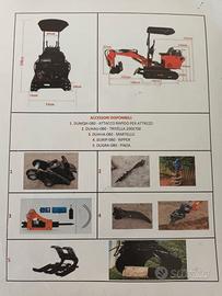 Capacità fino a 800kg con avviamento elettrico di potenza 7 Kw. Fornito di serie con due benne e tettuccio protettivo. Cingoli in gomma, motore monocilindrico diesel. Attacco trincia e trivella compresi.