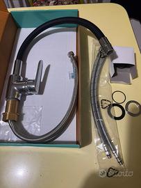 Vendo miscelatore per lavello cucina,in ottime condizioni,con flessibile nero modellabile nella posizione che si preferisce,l’ho usato solo un paio di mesi poi ho dovuto cambiarlo perche ho montato quello a tre vie perche ho istallato il depuratore d’acqua,e’ nuovissimo pagato alla brico75€ confezione originale,completo dei 2 flex nuovi(mai usati) e 2 un po piu lunghi da 50cm