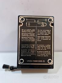 Misuratore di resistenza analogico in custodia metallica, prodotto in Germania da AEG, con scale multiple: x1, x10, x100 e x1000. Materiali utilizzati: ferro e vetro. Fornito in una custodia in pelle e con libretto di istruzioni.
