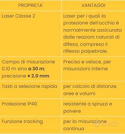 Con il Misuratore laser 30 metri TLM 99 STHT1-77138 STANLEY potete calcolare subito e con estrema precisione distanze, aree e volumi per muri, soffitti e stanze. Il risultato è un grande risparmio di tempo con una strumentazione limitata ad un solo utensile di pochi grammi. Calcola distanze in linea, aree e volumi, somma e sottrae le misure. Ha una precisione di ± 2.0 mm. La funzione calcolatrice di TLM99 permette di calcolare in modo preciso la quantità di materiale, vernice o rivestimento, necessari al lavoro. Caratteristiche: •Schermo 2 linee •Indice protezione pioggia e polvere IP40 •Disattivazione automatica: dopo 180 s •2 batterie AAA incluse (1.5V) •Durata della batteria (2x AAA) fino a 3000 misurazioni QUESTO ARTICOLO È NUOVO E NON PUO’ ESSERE SCONTATO ULTERIOMENTE.