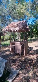 Il set include un bar con tetto in frange di paglia e due sgabelli e due poltroncine da bar, richiamando un'estetica tropicale. Tot 5 pz