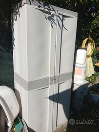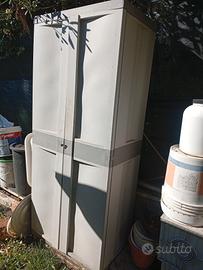 armadio in plastica da giardino cm 180*42*80 con 4 ripiani colore grigio chiaro l'anta destra in fondo è un po' rovinata ma l'armadio si chiude bene
