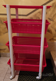 Mobiletto composto da 3 cestini e un ripiano superiore. I cestini misurano 36 × 46 × 12 h cm. Il Mobiletto completo è alto 86 cm. Dotato di 4 ruote per poterlo spostare comodamente.