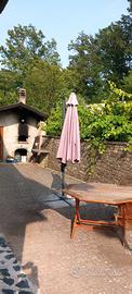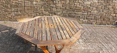 set da giardino in legno di teak nr. 1 tavolo esagonale L120cm. h72 cm., nr.1 ombrellone decentrato ottagonale THAILA 360 DIA 3m. Struttura in alluminio diametro dell'albero 50.68mm. telo in poliestere PU (200gr/m2) nr. 8 stecche in acciaio, sistema apertura a manovella, nr. 4 piastrelloni per ancoraggio basamento 40x40x4cm.