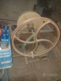 Grande mola per affilare tutti tipi di attrezzi sia manuale, sia elettrico (motore e cinghia) ad acqua, con vasca verniciata contro ruggine, scarico sotto. funziona, proprio un bel pezzo pietre media grossa di grana (pietra sabbiosa di non mi ricordo dove in germania) altezza fino a bordo vasca: 74cm, punto piu alto della pietra 98cm con interrutore 0/1