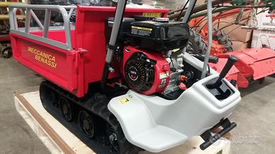 Motocarriola cingolata Meccanica Benassi modello MBP3500 - transporter professionale - motore a benzina 4,6hp valvole in testa - trasmissione meccanica Nagara: 6 marce AV+2 RM - velocità max 5 km - trazione posteriore - ribaltamento manuale - cassone con sponde apribili dimensioni pianale di carico (L x L x A = 90x60x20 cm) - carro con 4 rulli - portata kg 350.