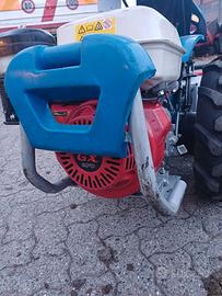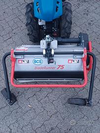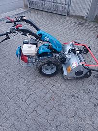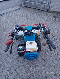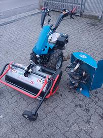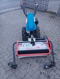 Motocoltivatore BCS, equipaggiato con motore benzina Honda GX270 da 9 hp con filtro aria bagno olio, frizione Powersafe, 3 marce avanti e 3 marce indietro con inversore, blocco e sblocco differenziale, ruote 5.0-10 in ottimo stato, freno di stazionamento con leva a manubrio. In foto è equipaggiato con trincia Bladerunner da 75 cm e in aggiunta la fresa da 66 cm