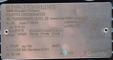 Vendo motoriduttore SEW FA67/G DRS80S4/TH, nuovo, mai usato, compreso di contro piastra per montaggio pendolare. Velocità [r/min]: 1730 / 10 Rapporto di riduz. totale [i]: 170,85 / Infinito Coppia d'uscita max [Nm]: 820 Coppia d'uscita [Nm]: 705 Tens.motore[V] / collegamento: 254/440 triangolo/stella Corrente nominale [A]: 3,00 / 1,73 Potenza motore [kW]: 0.75 Frequenza motore [Hz]: 60 Protezione motore: TH = Termostato Fattore di servizio SEW-FB: 1,15 Forma costruttiva: M1 Albero cavo: 40mm Opzioni generali: G Con tampone elastico Rapp. d'intermittenza S1-S10: S1