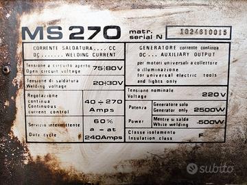 Vendo Motosaldatrice e generatore Mosa MS 270 per inutilizzo. Ingombro L 1400 x P730 x H950 tutto in mm