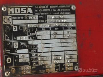 vendo motosaldatrice/motogeneratore mosa tipo TS 180 D/EL provvisto di avv. elettrico con batteria 12 volt. potenza 5 kw a Volt 380/220 motore diesel Ruggerini 8 HP a 3000 g/min. perfettamente funzionante qualsiasi prova .Macchina ideale per uso cantieristico di pronto intervento o anche come generatore corrente di emergenza per abitazioni rurali o villette. Manuali ed accessori (cavi x saldare, messa in moto, varie). Evitare perditempo.