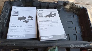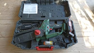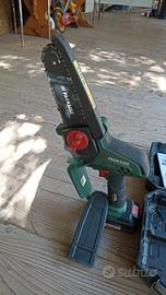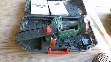 motosega a batteria Parkside,, protezione catena, olio, istruzioni e paracatena. ESCLUSA batteria e caricabatterie