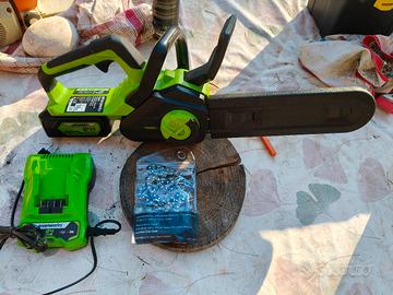 Vendo motosega a batteria Greenworks GD24CS30K4 con batteria (24V 4Ah) e caricabatterie, barra regolabile da 30cm e due catene. Tutto in ottime condizioni. 140€
