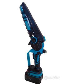 Motosega 8 pollici a batteria con display che segna la carica della batteria, ha il motore Brushless di alta qualità ed efficienza. La motosega è dotata di serbatoio per l immissione dell olio , per lubrificare la catena durante la sezione di taglio dei rami . La motosega è già assemblata all interno della sua valigetta, e non necessita il montaggio della barra guida e catena. All interno della valigetta include : 1 motosega 8 pollici, 2 batterie al litio da 10 amper e 6000 mha cadauna , 1 caricabatterie, 1 paio di guanti, 1 cacciavite, 1 paio di occhiali. In omaggio 1 catena di ricambio. Motore Brushless di alta qualità, efficienza e longevità. 1 anno di garanzia sul motore. Nuova.