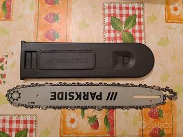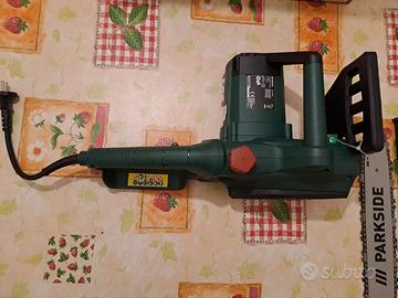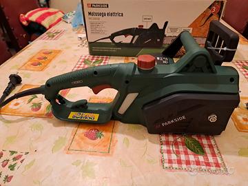 Motosega elettrica Parkside (Lidl) PKS 1600 B2 - Germany (lunghezza lama 42 cm, potenza allacciata 1600 watt; interruttore protettivo con arresto < 0,12 sec ) , cavo elettrico circa 1m. Nuova, mai usata. Scatola aperta per mostrarla.