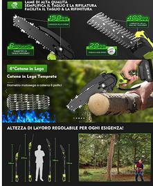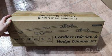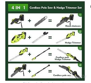 ️【Set potatore e tagliasiepi a batteria 4 in 1】sistema 4 in 1 (mini motosega, batteria potatore, tagliasiepi a batteria e tagliasiepi telescopico) taglia facilmente siepi alte, rami spessi e rami difficili da raggiungere. Le molteplici funzioni lo rendono ideale per potare alberi ad alto fusto, per la cura delle siepi e per ampi giardini. Facile sostituzione degli accessori per la massima versatilità nella cura del giardino. Angolo di taglio regolabile e asta telescopica: precisione a qualsiasi altezza: la sega telescopica si regola in modo continuo (0-135°), il tagliasiepi telescopico di 90°/135°. Con asta telescopica (tagliasiepi telescopico: fino a 215 cm, potatore elettrico: fino a 190 cm) è possibile raggiungere facilmente rami alti. Basta con scale e faticoso lavoro a mano! Il set di attrezzi da giardino garantisce un risultato di taglio pulito: bordi del prato, prato, erbacce su sentieri in giardino, siepi alte, rami spessi sono ideali per il multitool. Sistema di sicurezza multiplo e design ergonomico: protezione antischeggia e protezione per le mani bloccano le parti in giro. Funzionamento a due mani (pulsante di sicurezza + pulsante di accensione) impedisce l'avvio accidentale. Con occhiali protettivi e guanti antitaglio per una protezione completa. Impugnatura in gomma morbida, antiscivolo e antivibrazioni per una presa confortevole. Include guanto e tracolla per una distribuzione uniforme del peso, lavorando senza fatica per ore. Set potatore con batteria ricaricabile: dotato di due batterie da 4000 mAh (tempo di ricarica: 1,5-2 ore, autonomia: fino a 50 minuti). La grande capacità della batteria e la lunga durata consentono di lavorare senza preoccupazioni. È possibile lavorare senza interruzioni grazie alle batterie sostituibili e al caricabatterie in dotazione. Facile da utilizzare perfetto per grandi giardini per uso professionale costa al negozio intorno ai 200 euro se c'è l'annuncio è disponibile non fate offerte non è trattabile