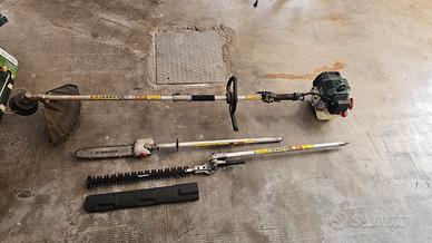 Vendo attrezzo multifunzione Parkside 4 in 1 a motore a scoppio, ideale per la manutenzione completa del giardino. Funzioni incluse: Decespugliatore (con filo) Lama tagliaerba Potatore (motosega su asta) Tagliasiepi Caratteristiche: Motore potente circa 1.45 kW (1.97 HP) Sistema modulare con cambio rapido degli accessori Asta lunga per lavorare anche in altezza Impugnatura ergonomica per maggiore controllo Condizioni: Usato ma funzionante Normali segni di utilizzo (come da foto) Completo di accessori originali e protezioni Ideale per chi vuole un unico attrezzo per tutto il giardino senza spendere troppo. SOLO RITIRO IN ZONA
