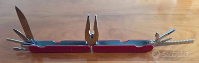 MULTIFUNZIONE SVIZZERO. Multifunzione 9 funzioni: levacapsule con cacciavite, lama piccola, lama grande, apribottiglie, pinza, apriscatole, cacciavite a stella, pulisci unghie e seghetto con righello. Dimensioni: chiuso cm 10 x cm 3. Colore rosso, nuovo nella scatola e custodia in pelle. Euro 7.