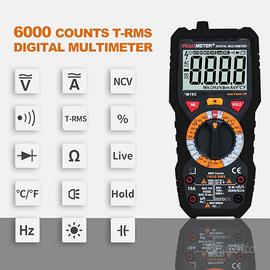 •Multimetro Professionale, Parametri principali: Tensione AC / DC, Corrente AC / DC, Resistenza, Frequenza, Ciclo di lavoro, Temperatura, NCV (NCV significa rilevamento Tensioni senza contatto) Vero multimetro RMS, Test diodi, Rilevamento di Fase e Neutro in Corrente Alternata, Test Continuità con segnale acustico, Torcia elettrica per illuminazione campo di lavoro.