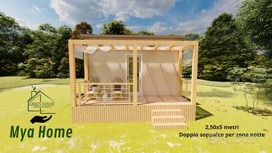 Mya Home è una casetta prefabbricata 2,50x5 metri, dotata di doppio soppalco per la zona notte, bagno e zona living+cucina zona giorno. Struttura consegnata chiavi in mano (completa di infissi, sanitari, impianto idrico/elettrico, pavimento e mattonelle).