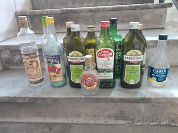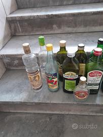 Nr. 12 bottiglie: 7 per l'olio, 3 per bibite, 1 per l'aceto, 1 per il succo d'acero per i pan cakes. Disponibili, per inutilizzo, 2 damigiane, 20 bottiglie varie capacità, 11 bottiglie con il tappo automatico, 20 barattoli grandi per realizzare vasi, 70 medi e 40 per candele, minuterie, bricolage, vasi, sottovasi, portapiante balconiere, 1 cuscino/materassino per sedia sdraio tipo Scab, 1 tappeto in gomma lungo circa 3 mt, 20 specchi e 18 mensole vari tipi, misure, colori, epoche, prezzi, 2 lastre di vetro fumè alte cm 227, cesti da addobbare per presentare bomboniere.