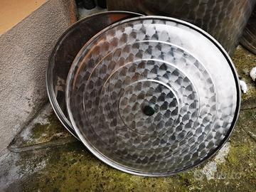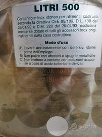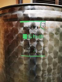 N. 2 NUOVI Serbatoio tino contenitore a fondo piano in acciaio Inox 18/10, AISI 304, da litri 500, idonei per alimenti, finitura fiorettata.