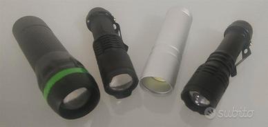 4 mini torce a led, di cui 3 in alluminio e una in plastica. Tutte sono alimentate a pile (non incluse) e hanno la possibilità di light zoom.