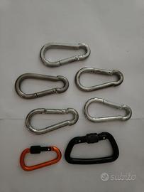 N.5 moschettoni 10x100 carico 180kg, in acciaio inox, per altalene, vele da sole, per amache, cesti appesi, slackline, negli sport equestri, da campeggio, in giardino, gancio sacco da boxe, sport acquatici e molto altro. N.1 moschettone con chiusura Hanging per blocco moschettone in acciaio nero. N.1 moschettone in alluminio d-ring con molla moschettone a vite blocco clip D per fibbia portachiavi. Vendesi tutti e sette in blocco. Come da foto nell'annuncio.