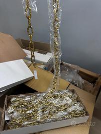 Nastro decorativo color argento e catena decorativa color oro. In perfette condizioni, nuovi ancora con cartellino. No spedizioni, ritiro a mano o a carico dell'acquirente. Prezzi vantaggiosi, valutiamo sconti per acquisto intero stock.
