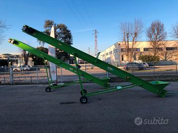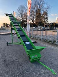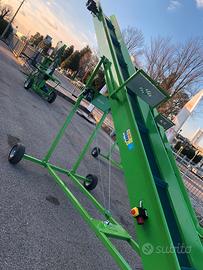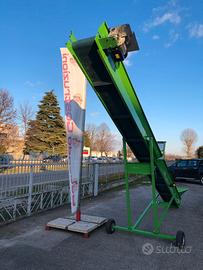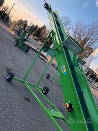 Tappeto in PVC vulcanizzato. Carrello per trasporto interamente imbullonato. Carrello con ruote gonfiabili su cuscinetti diametro 360 mm. Carrello con argano a frizione per regolazione alzata posizionato in sicurezza esternalmente alla macchina. Rete di protezione anticaduta legna. Spondina altezza 150 mm. Tramoggia di carico completamente smontabile per trasporto. Timone per trasporto smontabile.