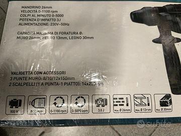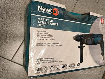 NEWTON Martello tassellatore 800 w, attacco sds-plus. Ancora con scatola e in cellophane MAI USATO. Non ho scontrino e ne garanzia ma è un articolo tenuto bene in posto asciutto. Mandrino 26 mm velocità 0-1100rpm colpi a minuto 0-5000 potenza di impatto 3 j Alimentazione corrente Capacità massima di foratura diametro Muro 26mm ferro 13 nm legno 30 mm La ricetta con accessori 3. Muro 8/10/12 * 150 mm Due scalpelli una punta uno piatto 14 * 250 mm 800 watt di Potenza Possibilità di ritirare a mano a Milano e limitrofi